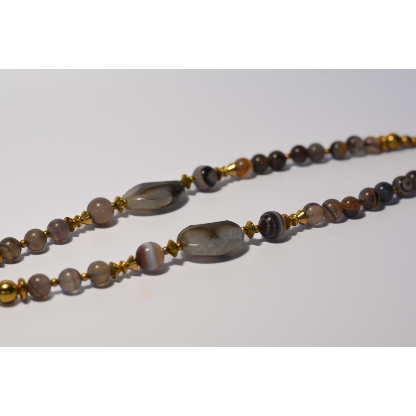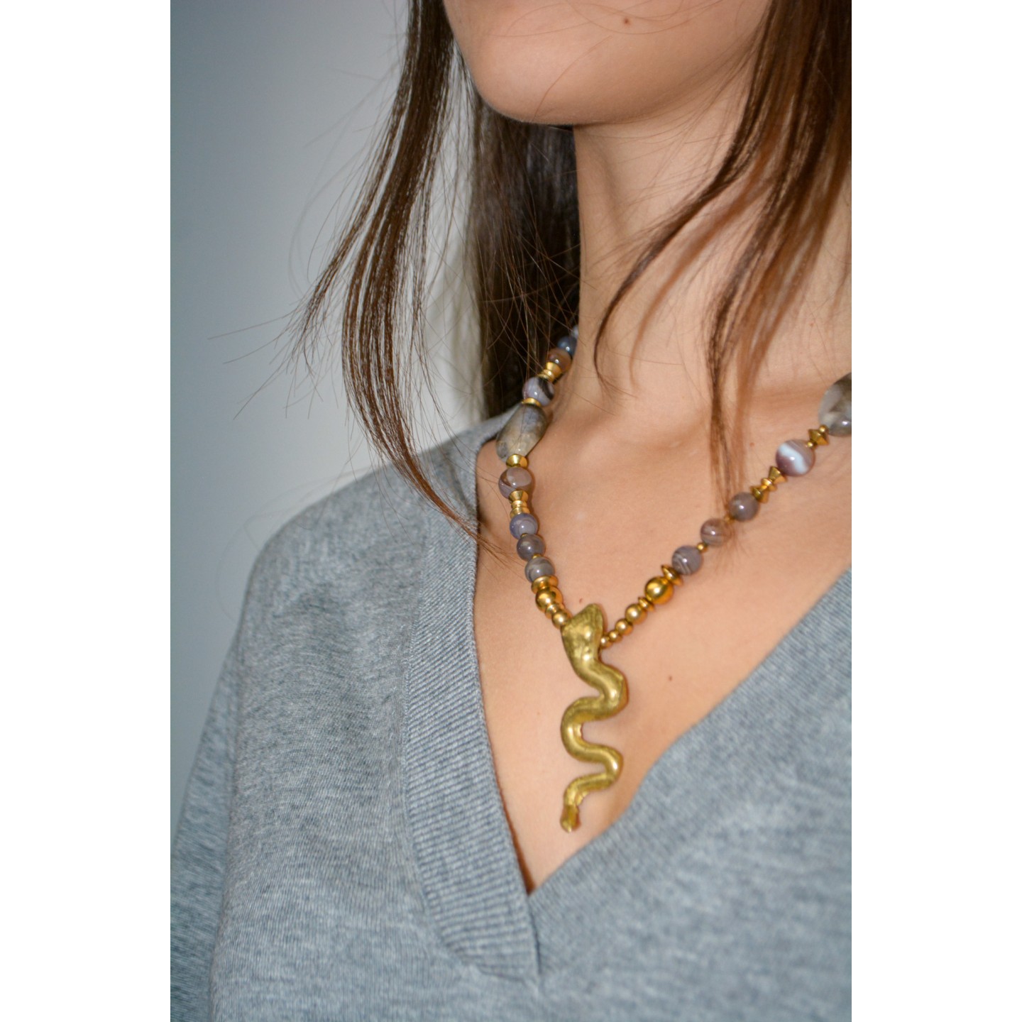 Perles naturelles d'Agate Botswana, diamètre 8mm et 10mm. Perles naturelles d'Agate à facettes au centre. Pendentif: serpent en bronze. Montage: laiton. Mesure: cm