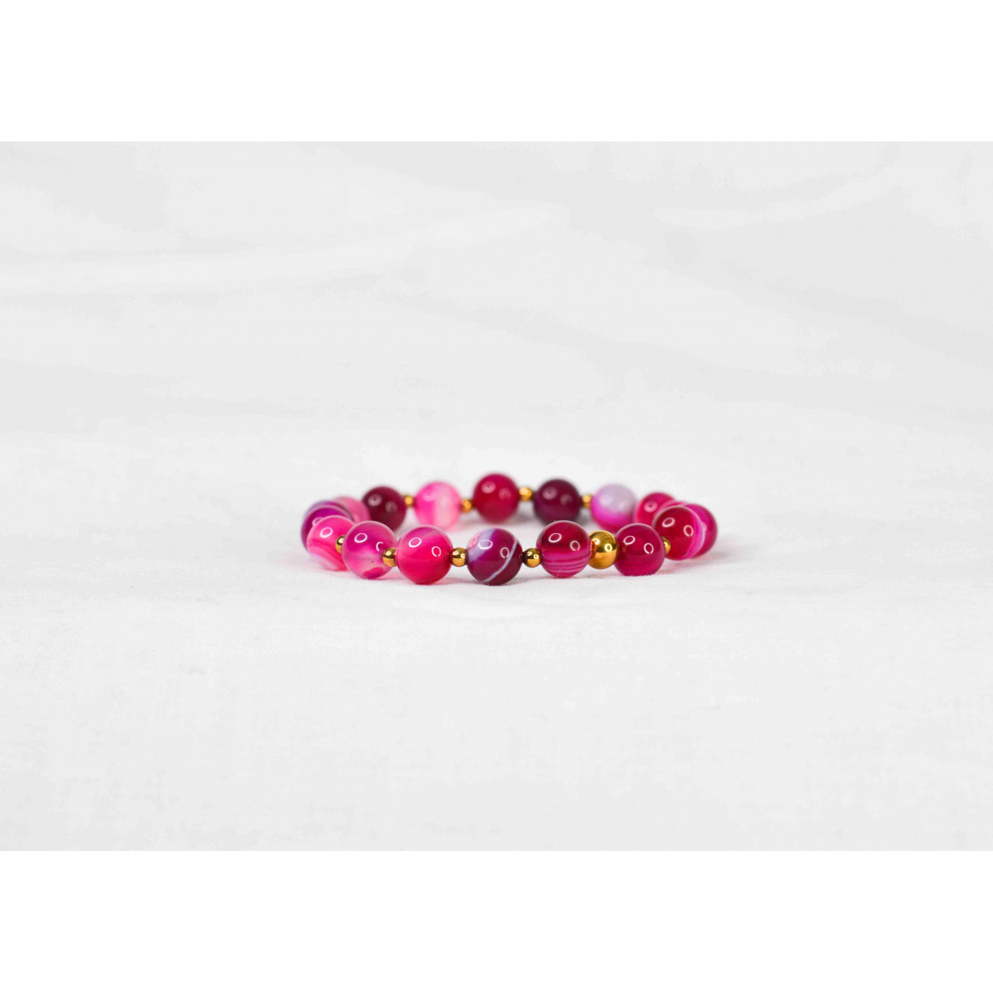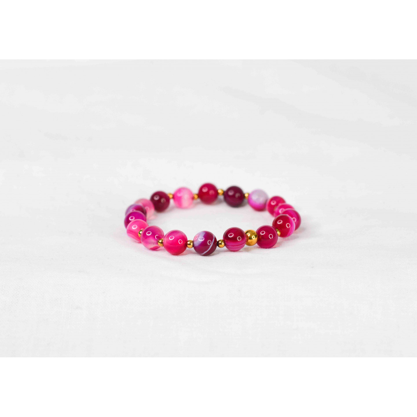 Perles naturelles d'Agate rayures fuschia, diamètre 8mm. Acier inoxydable doré. Taille: 15-17cm