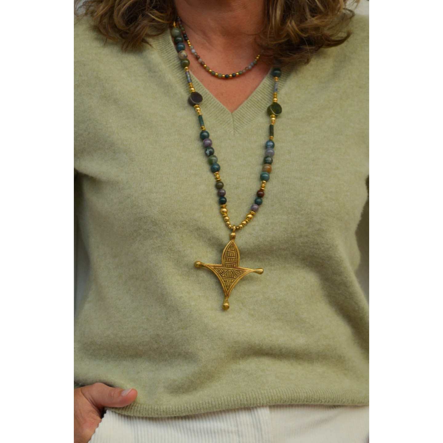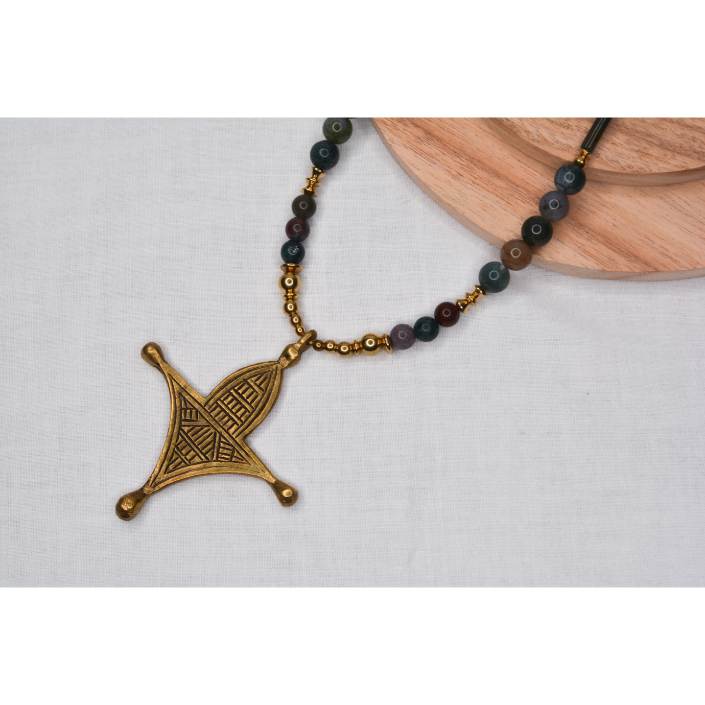 Perles naturelles d’Agate Indienne, diamètre 8mm et 10mm. Perles centrales en Agate et Agate Indienne. Pendentif : croix touarègue en bronze. Montage : laiton. Mesure : 88cm.