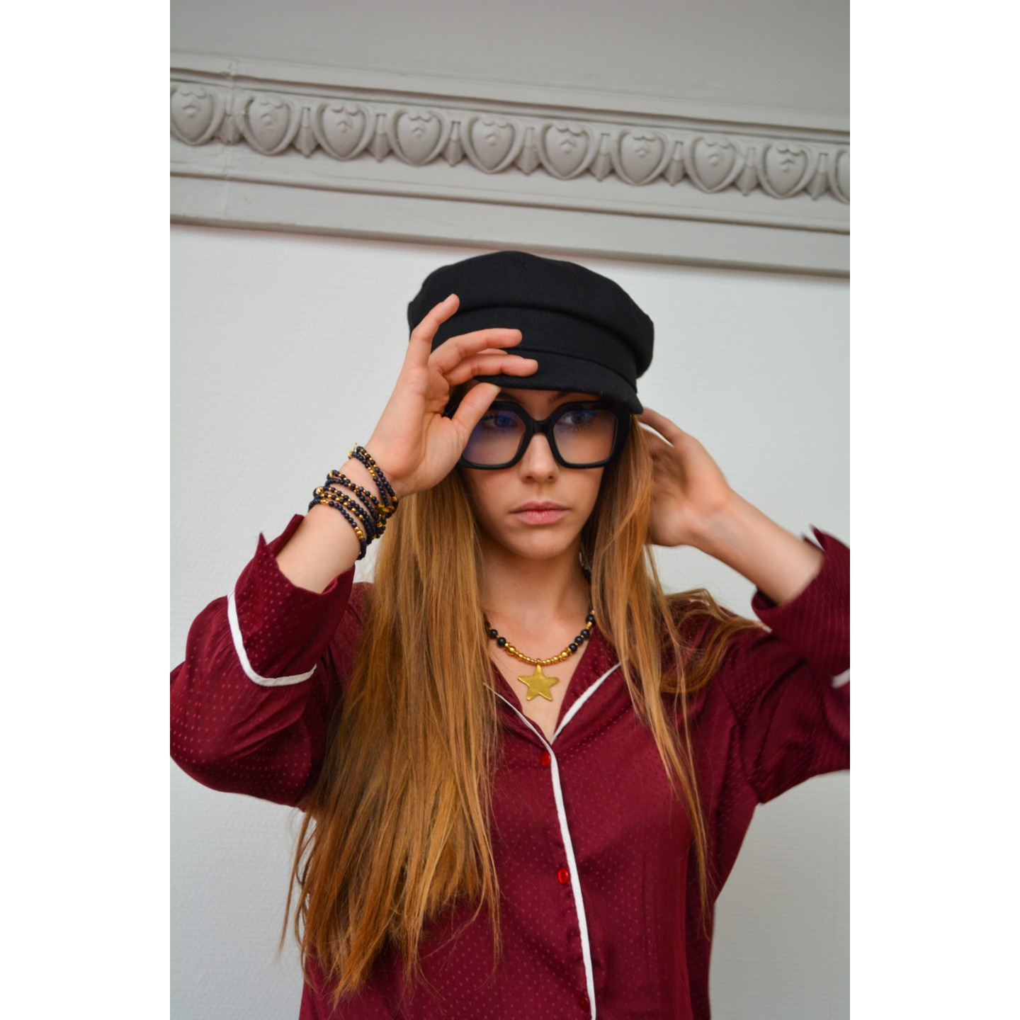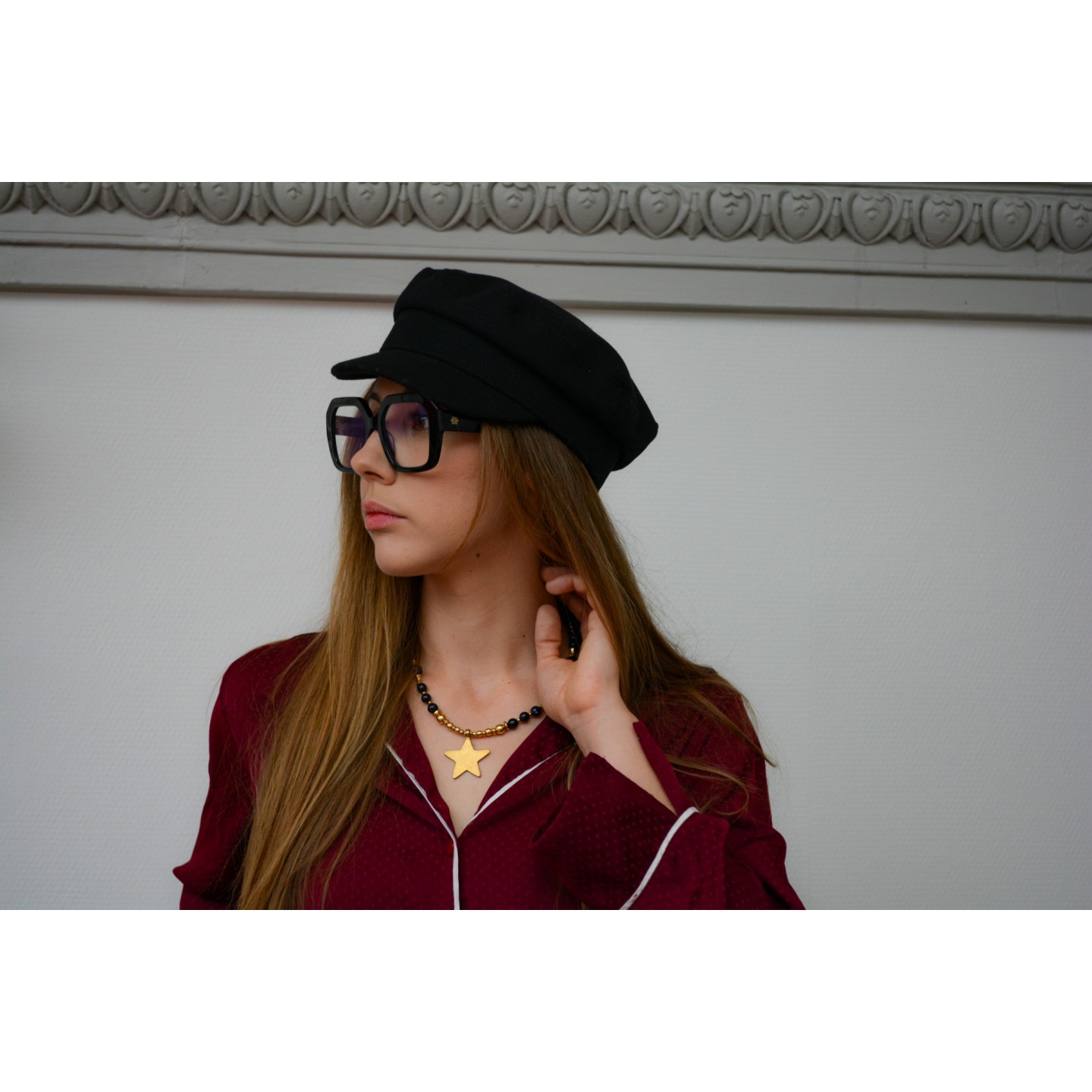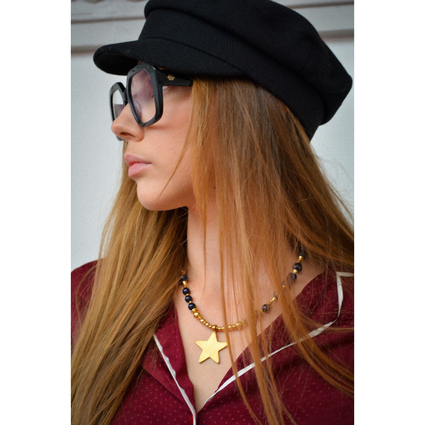 Perles naturelles de Blue Sandstone. Diamètre 8 et 10 mm. Pendentif étoile en Bronze. Montage en laiton. Mesure : 49cm.
