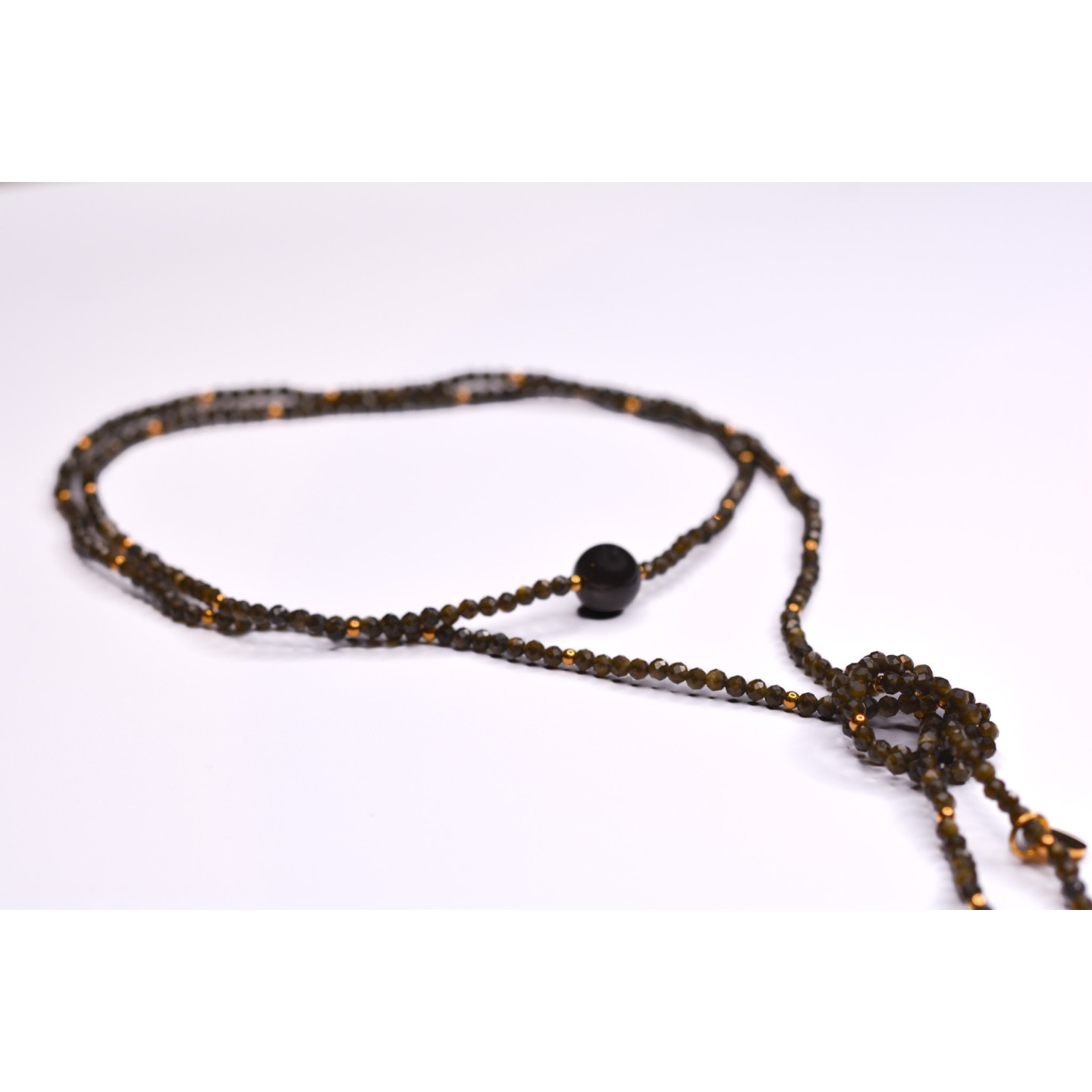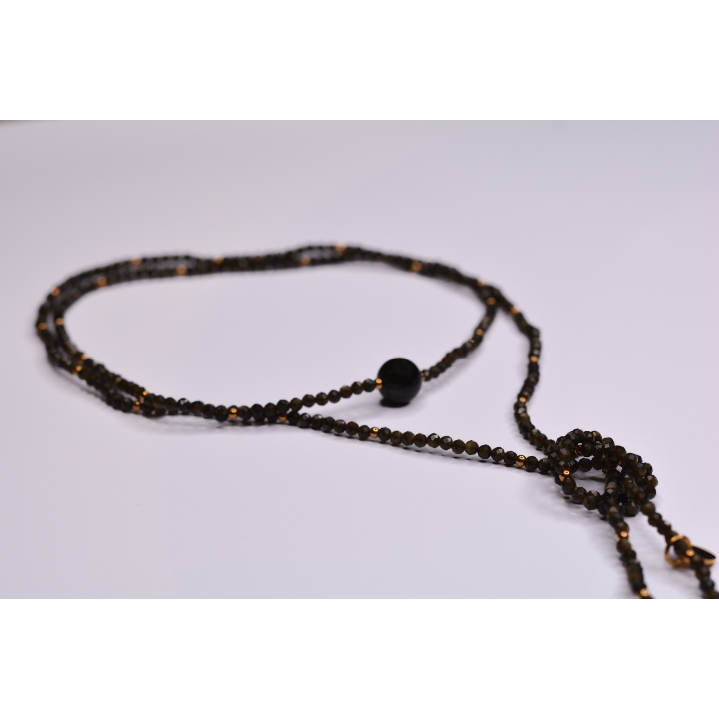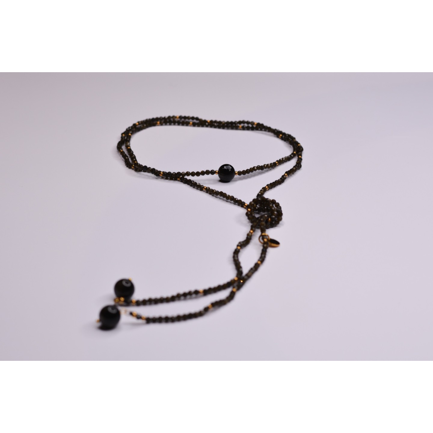 Collier "cravate". Perles naturelles d'Obsidienne Gold à facettes, diamètre 3mm et 10mm. Acier inoxydable doré. Mesure: 120cm