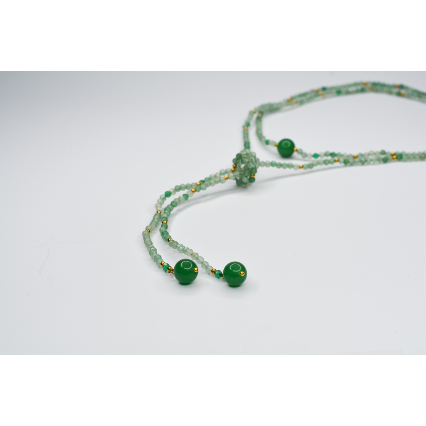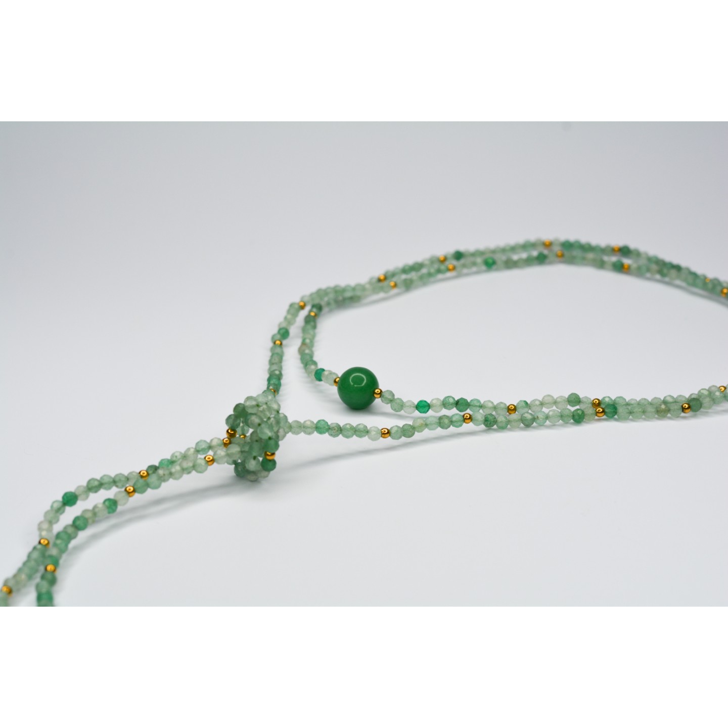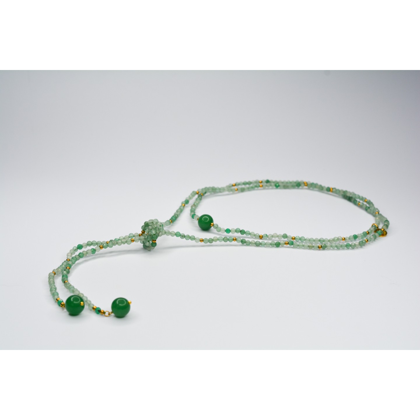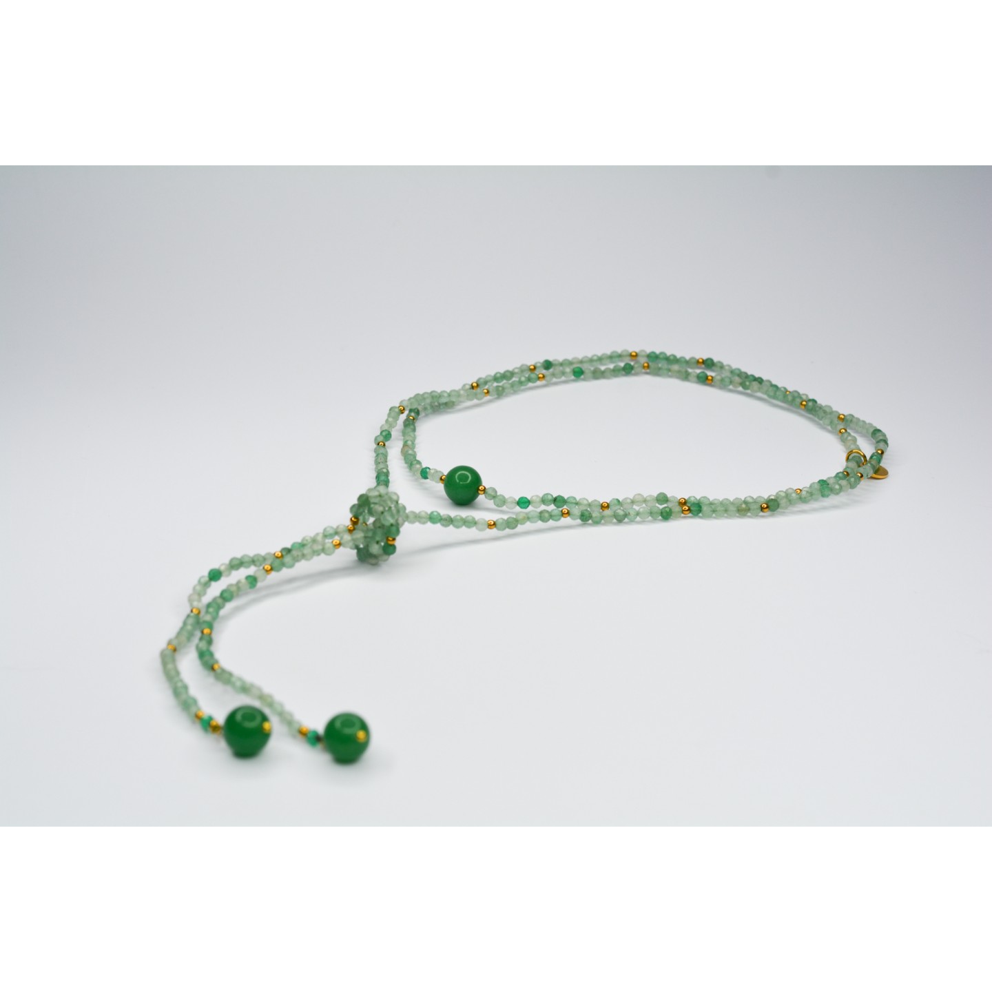 Collier "cravate". Perles naturelles d'Aventurine verte à facettes, diamètre 3mm et 10mm. Acier inoxydable doré. Mesure: 120cm
