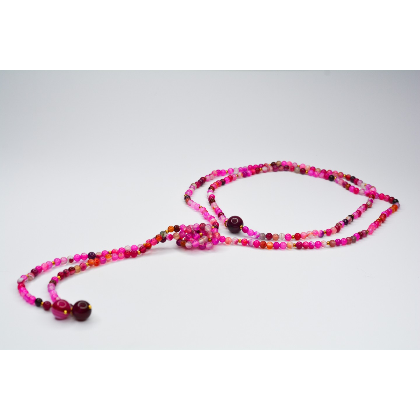 Collier "cravate". Perles naturelles d'Agate Fushia rayée, diamètre 4mm et 10mm. Acier inoxydable doré. Mesure: 120cm