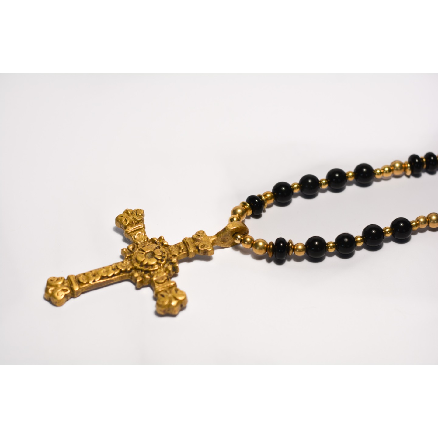Perles naturelles d'Onyx noir et d'Onyx noir mat, diamètre 8mm et 10mm. Perles naturelles d'Onyx noir, en forme de rondelle boulier, 5mm x 8mm. Pendentif: croix en bronze. Montage: laiton. Mesure: cm