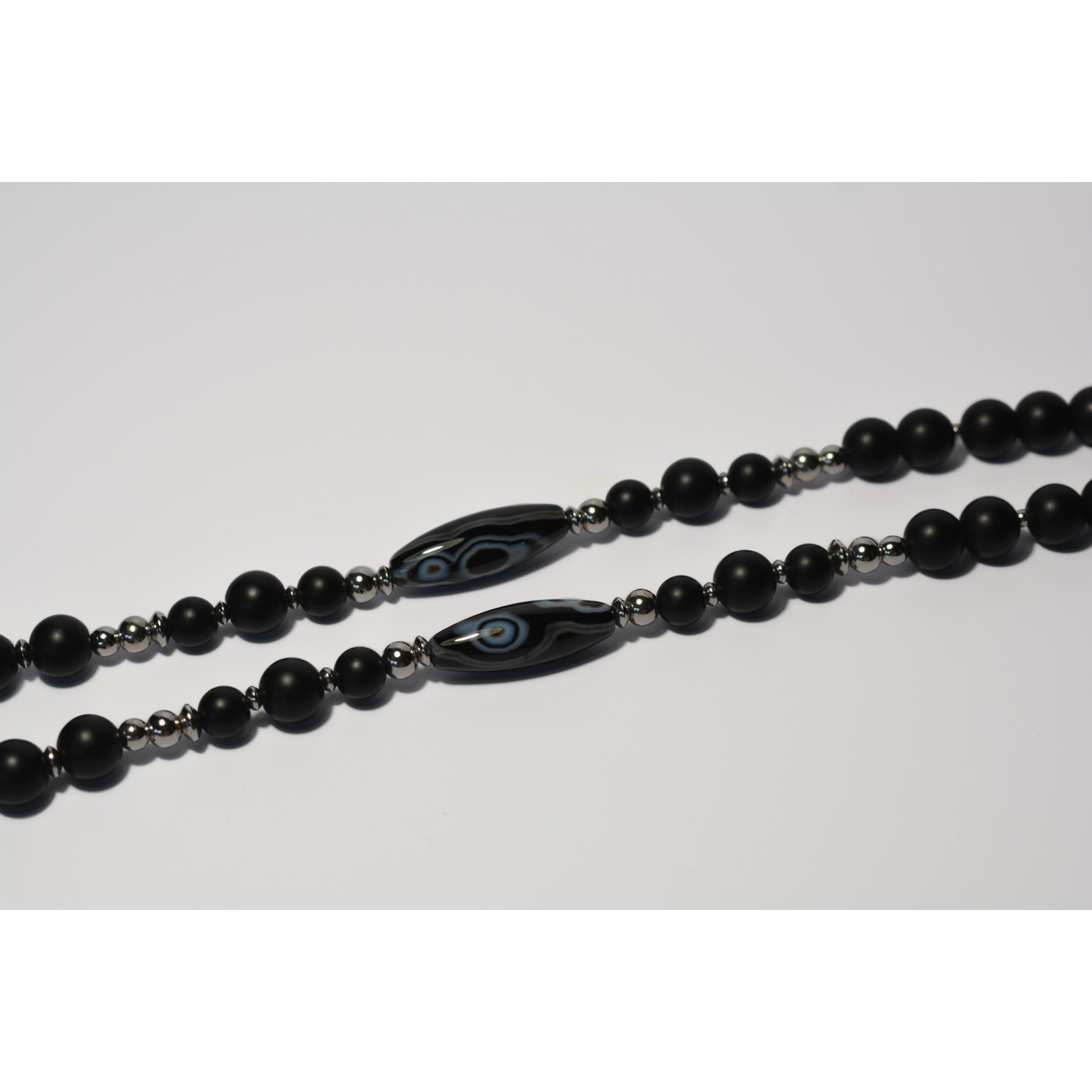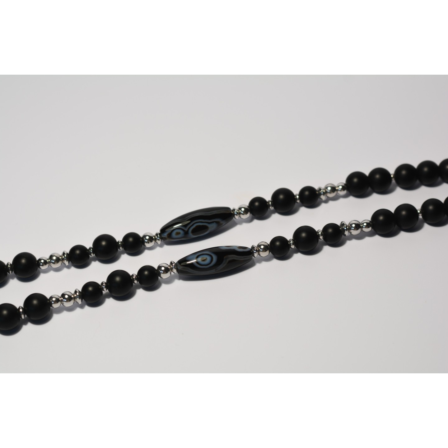 Perles naturelles d'Onyx mat, diamètre 8mm et 10mm. Perles naturelles d'Agate rayée au centre. Pendentif: croix éthiopienne en bronze argenté. Montage: acier inoxydable argent. Mesure: 92cm