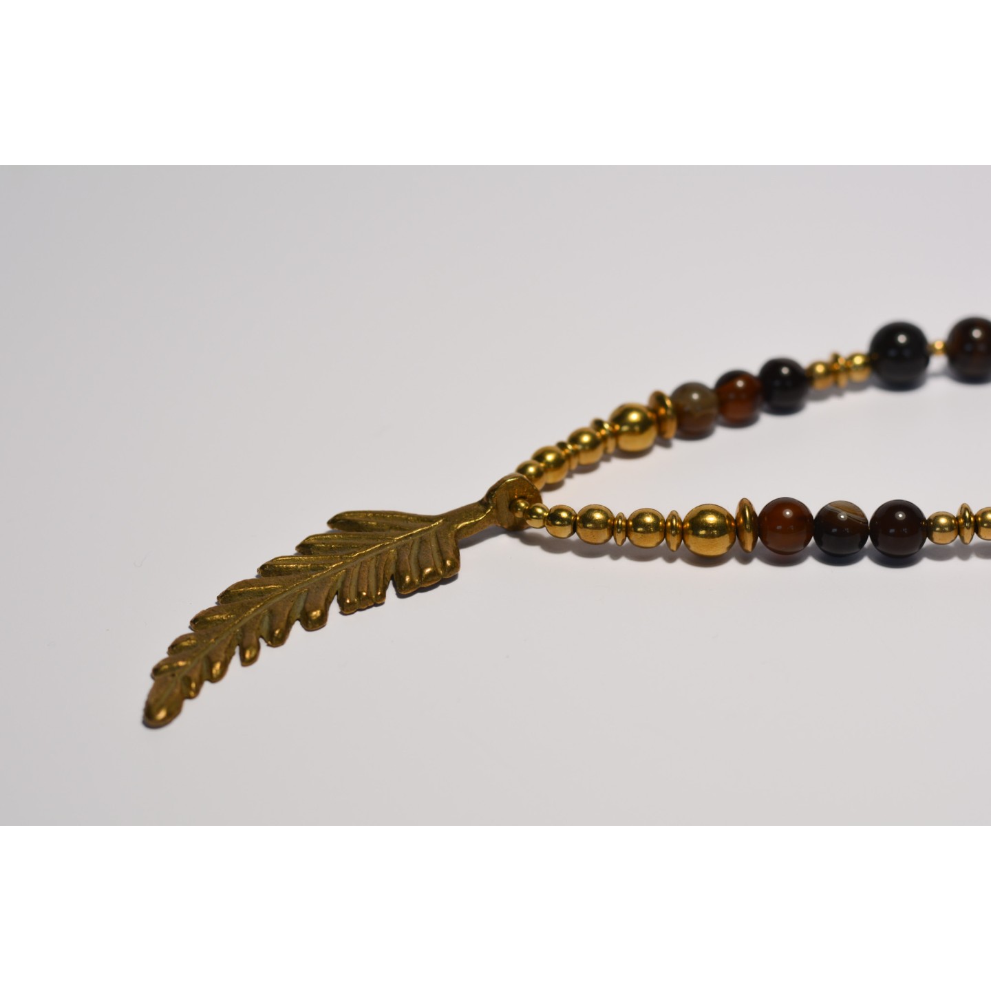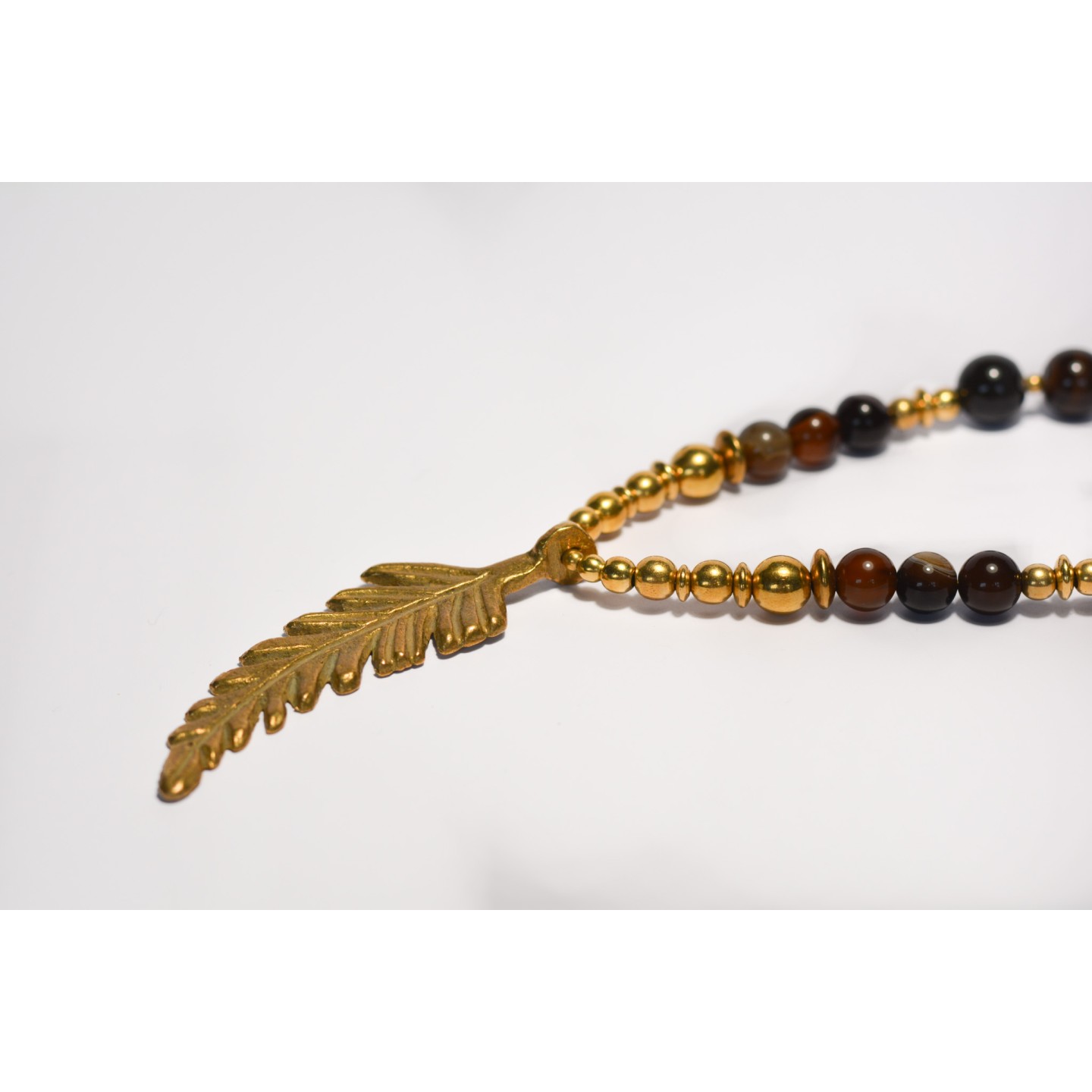 Perles naturelles d'Agate marron, diamètre 8mm et 10mm. Perles naturelles d'Agate à facettes au centre. Pendentif : Plume en bronze. Montage : Laiton. Mesure :