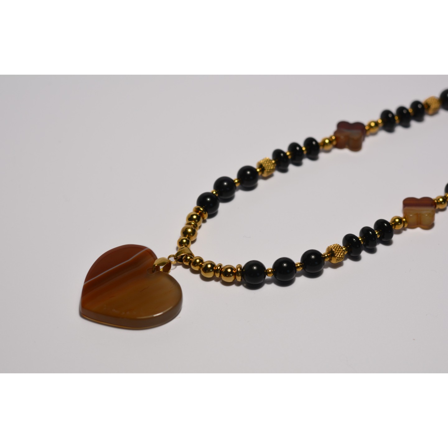 Perles naturelles d'Obsidienne Silver, diamètre 8mm et perles naturelles d'Onyx noir, forme rondelle de boulier, diamètre 5mm x8mm. Trèfles en Agate marbré orange. Pendentif en Agate marbré orange 25mm x 35mm. Acier inoxydable doré. Mesure: 53cm
