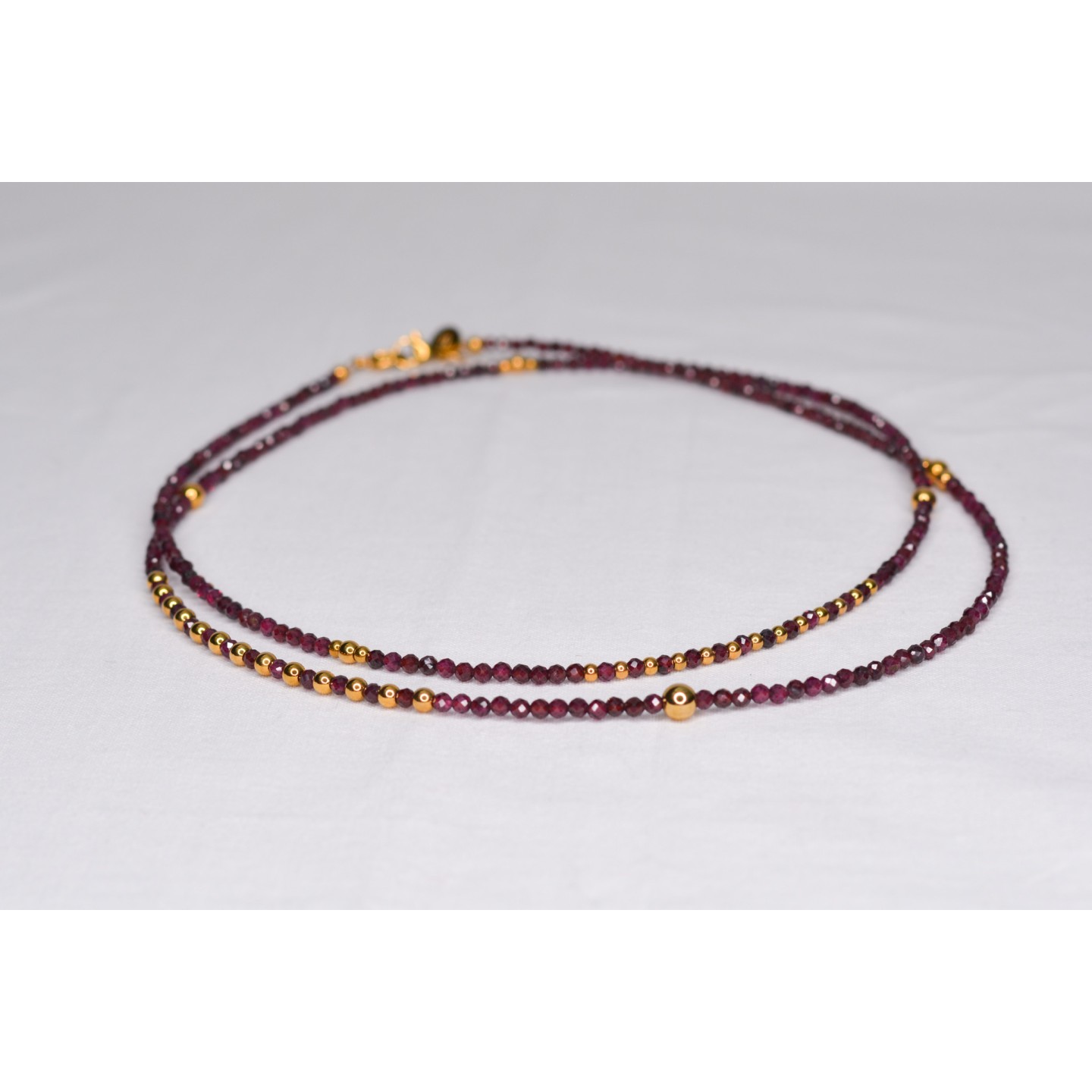 Perles naturelles de Grenat à facettes, diamètre 3mm. Possibilité de le porter en double tour. Acier inoxydable doré. Mesure: 96cm