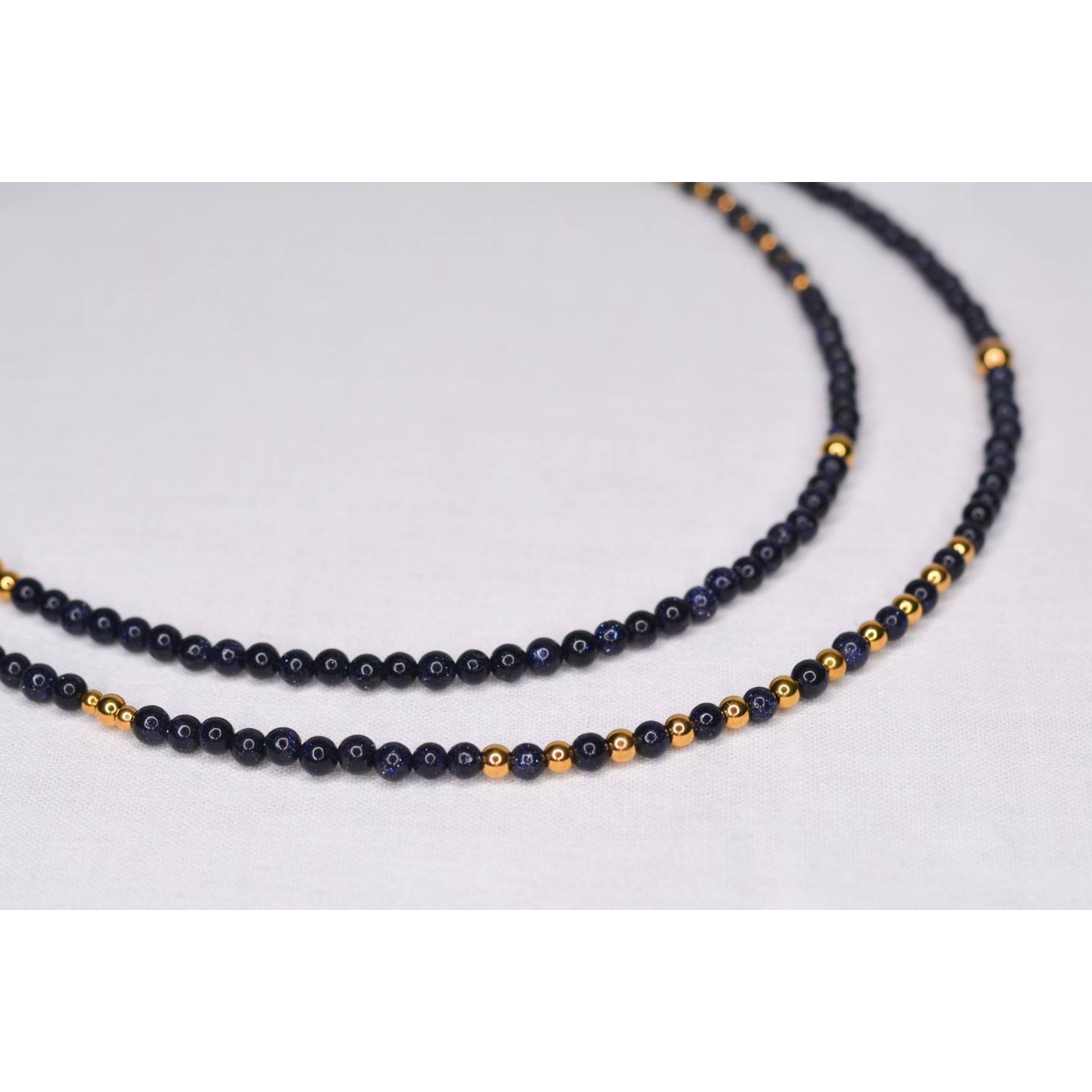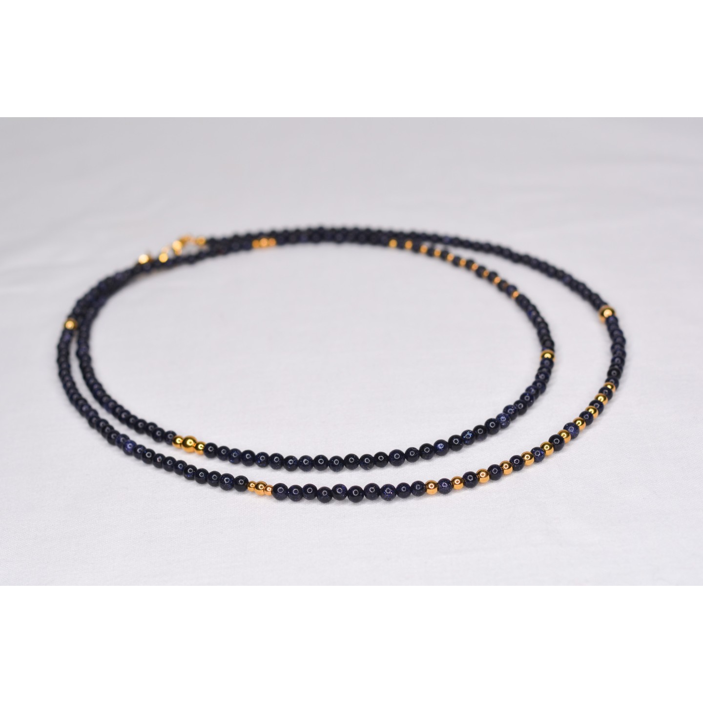 Perles naturelles de Blue Sandstone, diamètre 4mm. Possibilité de le porter en double tour. Acier inoxydable doré. Mesure: 101cm