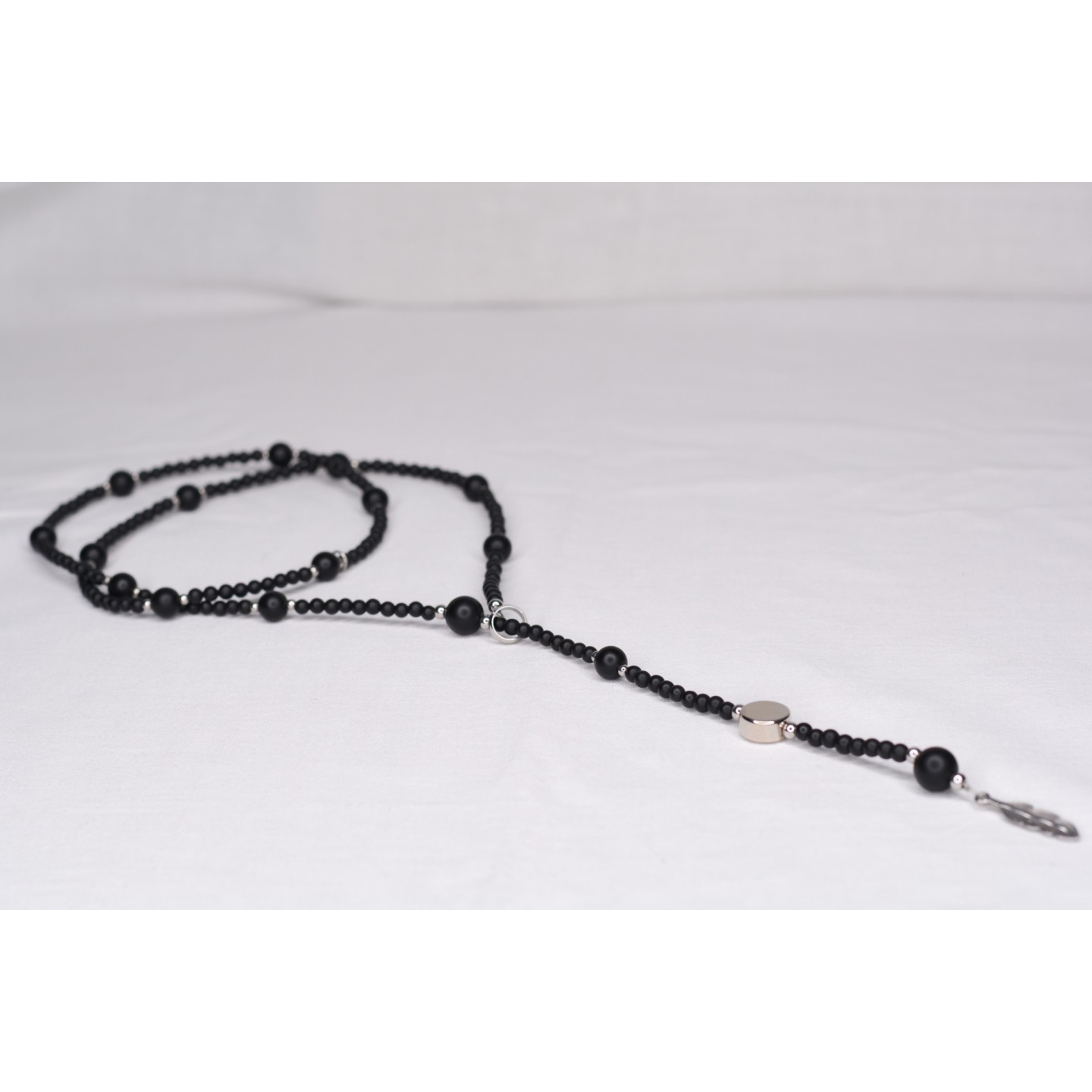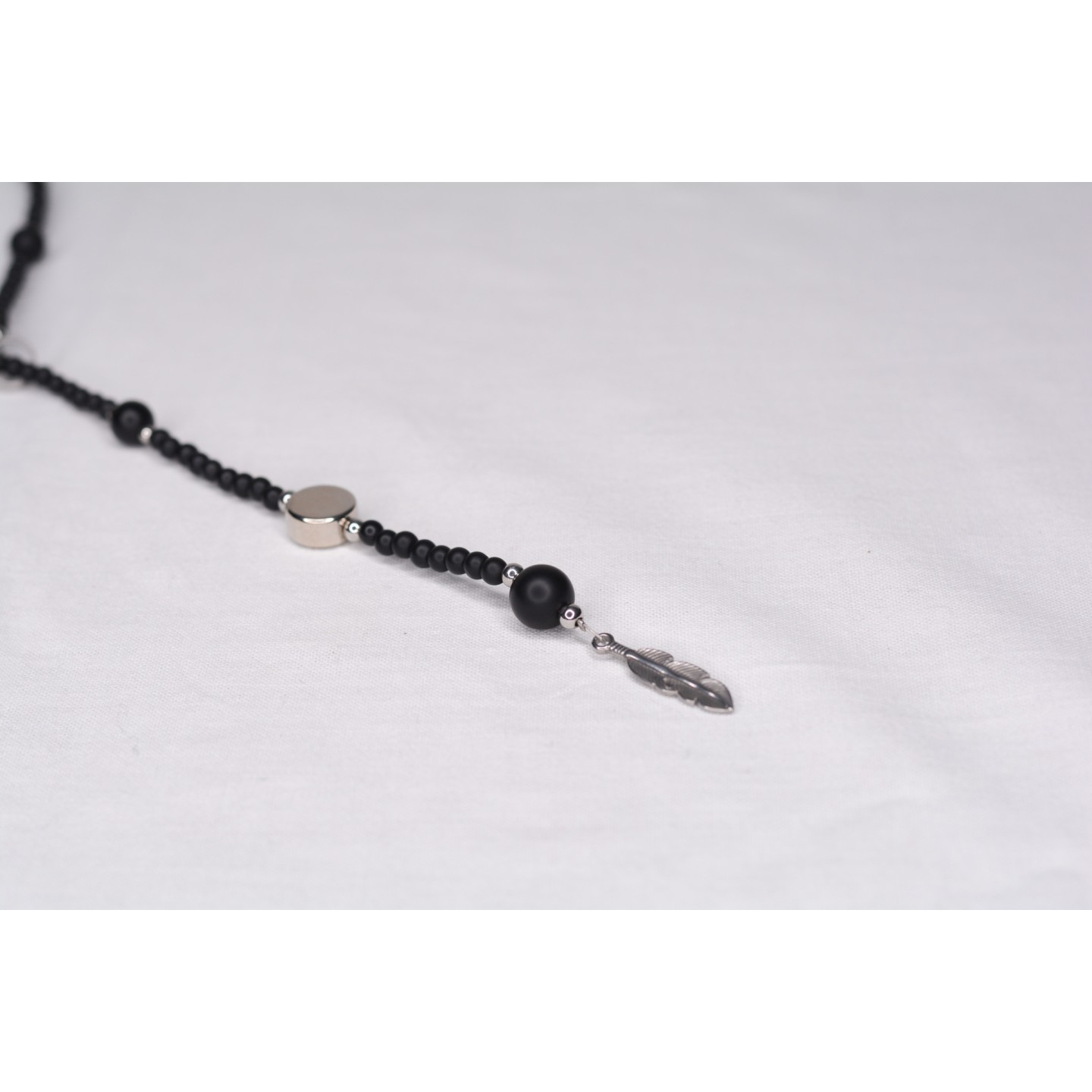 Pendentif plume. Perles naturelles d'Onyx mat, diamètre 4mm, 8mm et 10mm. Acier inoxydable argent. Mesure: 104cm